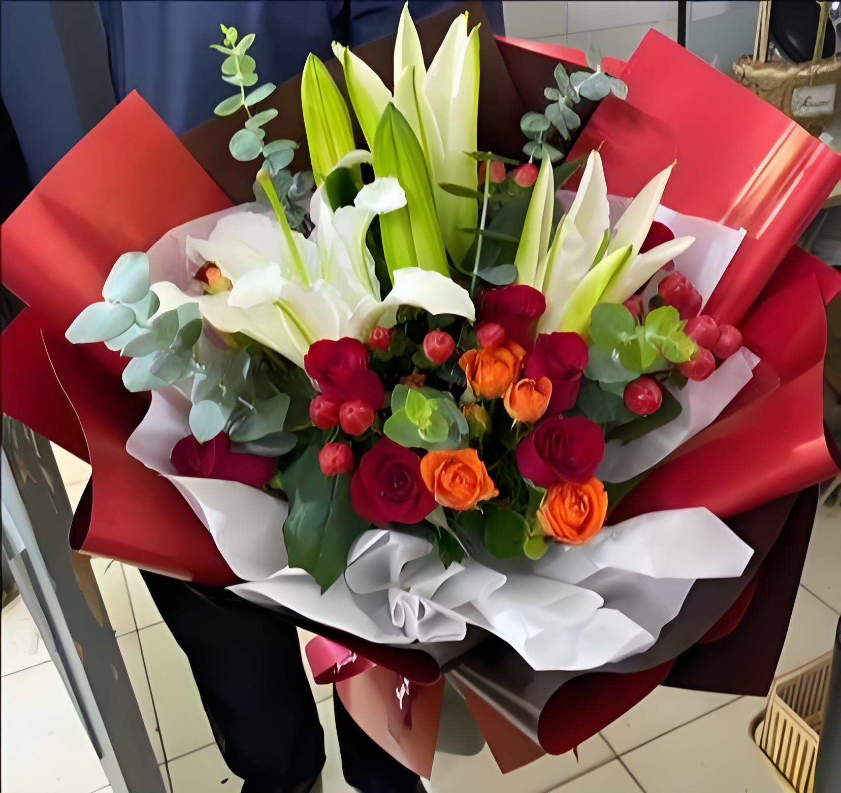 黄冈浠水县花店包11枝红玫瑰、2枝多头白百合、6枝橙色多头玫瑰、红豆、尤加利叶